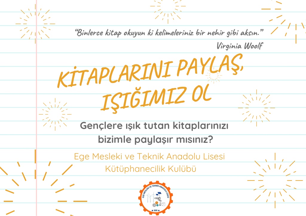 Okulumuz kütüphanesini zenginleştirmek için 'Kitaplarını Paylaş, Işığımız Ol' adı altında bir kitap bağışı kampanyası düzenliyoruz. Kütüphaneler bir okulun kalbidir. Yepyeni bir dünyanın kapılarını aralayabilecek kitapları kütüphanemize kazandırarak, bu kalbin atışını birlikte güçlendirelim.